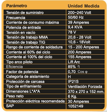 tecnología IGBT, para proceso de soldadura arco manual y Tig Lift Arc. Es Portátil, fácil de usar y con bajo consumo de